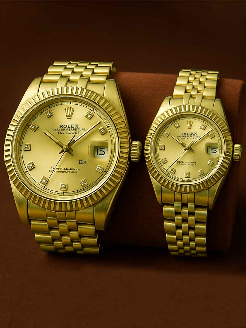 ست لوکس رولکس Datejust شامل یک ساعت مردانه و یک ساعت زنانه در تون طلایی طبیعی با صفحه شامپاینی و نشانگرهای الماس — مناسب هدیه رسمی و ستهای ویژه. بستهبندی شیک و ضمانت اصالت.