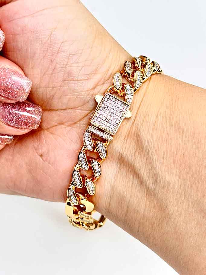 قفل مربعی دستبند با طراحی مدرن و پرنگین خود، نقطهی تمرکز چشمنواز این مدل است. ساختهشده از آلیاژ باکیفیت و آبکاری طلایی چندلایه، مقاوم در برابر تغییر رنگ و حساسیت پوستی.