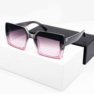 عینک آفتابی زنانه با فریم مربعی و لنز گرادیانت صورتی–دودی؛ استایل اوورسایز، جذاب و ترند روز. فریم کریستالی مشکی-خاکستری، لنزهای سبک با پوشش UV400 برای حفاظت از چشم، مناسب استایلهای شهری و مهمانی.