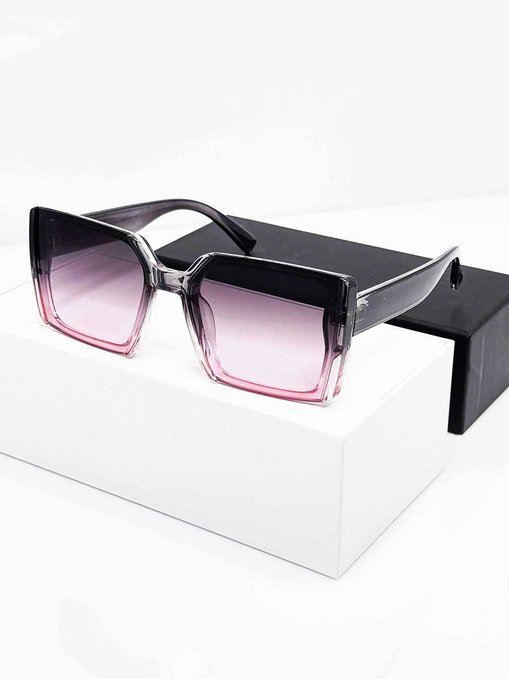 عینک آفتابی زنانه با فریم مربعی و لنز گرادیانت صورتی–دودی؛ استایل اوورسایز، جذاب و ترند روز. فریم کریستالی مشکی-خاکستری، لنزهای سبک با پوشش UV400 برای حفاظت از چشم، مناسب استایلهای شهری و مهمانی.